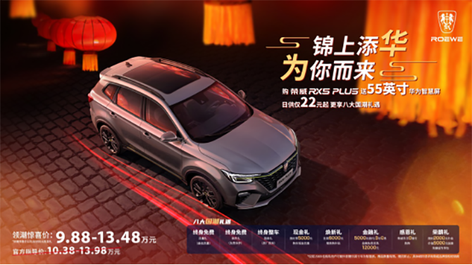 在刚刚过去的12月,荣威RX5系列热销破2万,环比增长近60%!为回馈广大用户的青睐,值此新春来临之际,上汽荣威携手华为送大礼,限量15000名,数量有限,赠完即止!用户购买荣威RX5 PLUS系列任意车型,不仅可获赠一台55英寸价值3299元的华为智慧屏S,还可享受包含终身免费保养、终身原厂质保、终身免费基础流量在内的“3大终身权益”,以及“5大国潮礼遇”,9.88万元起就可轻松入手火爆国潮单品。