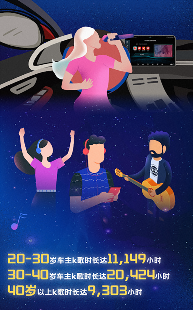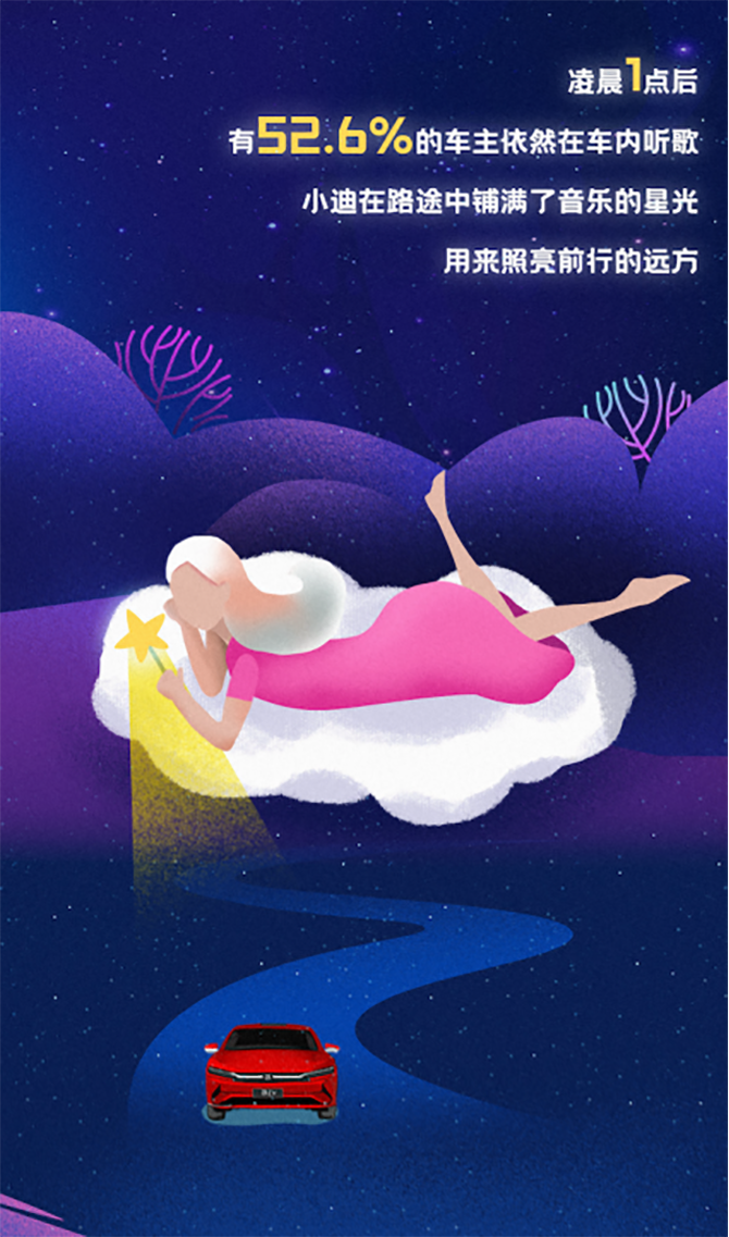 在2020年的数据统计中,有这样一组:凌晨1点后,有52.6%的车主依然在车内听歌。或许那时的Ta们刚刚下班回家;或许那一刻的Ta们刚刚应酬完毕;或许Ta们回家前希望在车里独处一会儿。而比亚迪DiLink智能网联系统的车内K歌功能在这一年里也被使用了40,876小时。