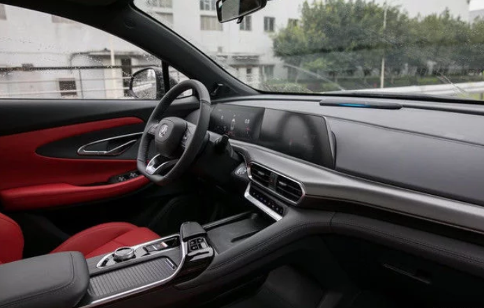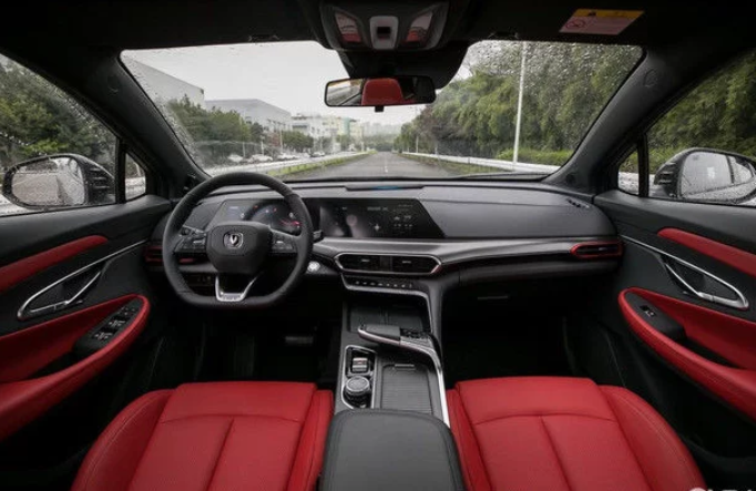 内饰方面,UNI-T看起来也个性十足,新车的中控台采用了镂空设计,意在提升车内的储物空间。同时设计师也利用镂空的空间也在挡把前方设置了15W无线快充,使用起来更加便捷,车内配备了一体式双10.25英寸高清触摸屏,采用略微倾向主驾的8.1°夹角设计,具备光线自适应功能。搭载了一体式运动座椅,材质为NAPPA真皮,通过红色缝线进行点缀,运动气息更足。
