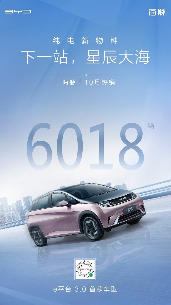 e平台 3.0首款车型海豚,10月热销6,018辆